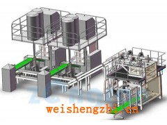 小袋產品→水平輸送機→雙層傾斜輸送機→高速輸送機→計數理包機→編織袋全自動包裝機→縫包機→編織袋產品輸出。